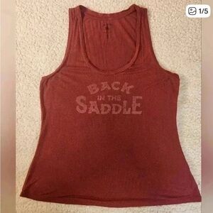 This stylish sleeveless top by Idyllwind features a deep rusty red color and a scoop neckline. The soft and slightly textured fabric adds a comfortable touch to this versatile piece. The front has text printed in a lighter color, adding a unique detail to the design. in good pre-owned condition, there is a small snag that has to be magnified to be seen, see pictures.