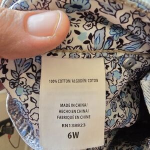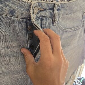 Distressed denim cutoff shorts from Idyllwind by Miranda Lambert, women’s size 6. Made from 100% cotton, these light wash jean shorts feature frayed hems, a button fly, and subtle back pocket stitching for a touch of Western style. The interior waistband is lined with a floral pattern for a unique detail. Gently used and in good condition. Please note we do have pets in our home.