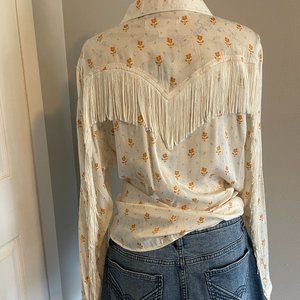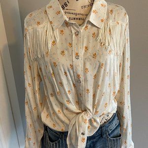 Check out this beautiful western shirt straight out of Miranda Lambert's collection! It has decorative buttons and fringe that goes both down the arms and across the back. Shirt was worn once for a concert with the suede fringe vest (also listed for sale with a bundle price given if interested, just ask!) and as you can see in one of the pictures the color from the vest kind of bled through onto the crease line of the shirt. It's not visible when it's on.