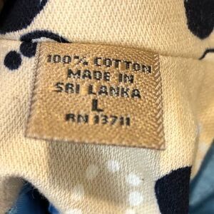 I.e. button down trench coat with pockets. Tan with Blue, white black circle design throughout. Blue lining. Buttons up to the neck. Good condition, a few small stains, not very noticeable. Length 30in, sleeve 23.5in, pit to pit 18in. size large