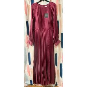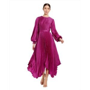 • Other information: Long sleeve pleated gown with a high neckline, blouson sleeves, pleated bodice, and a thigh-high slit.
