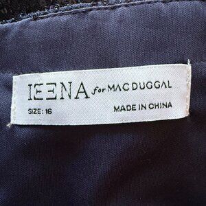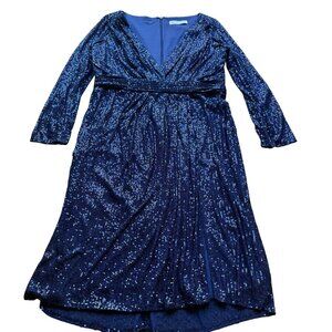 sequin cocktail dress, navy blue dress, long sleeve dress, V-neck sequin dress, knee-length dress, evening gown, formal dress, elegant cocktail attire, Mac Duggal dress, party dress, semi-formal dress, plus size dress, Ieena for Mac Duggal