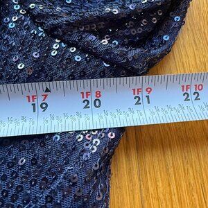 A sophisticated navy blue cocktail dress adorned with shimmering sequins. Features a flattering V-neckline, long sleeves, and a defined waistline for an elegant silhouette.