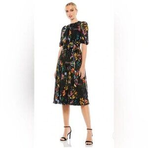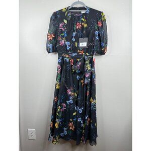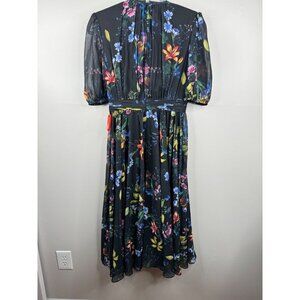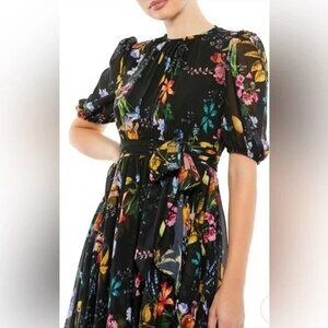 Ieena Mac Duggal 55625 Belted Black Floral Chiffon Midi Dress Sz. 2 NWT Colorful
