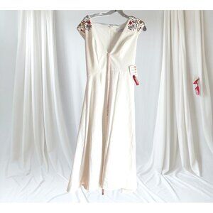 Ieena Mac Duggal Dress Womens 2 White Embellished Midi Floral Beaded Cap Sleeve