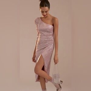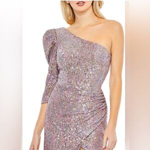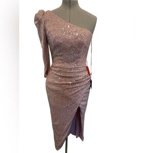 Ieena Mac Duggal NWT Sz 4 Sequin One Shoulder Faux Wrap Dress Midi Mauve Multi
