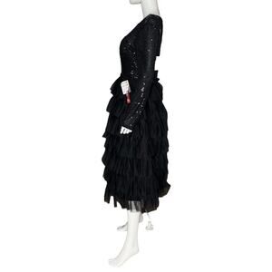 Chic tea-length dress with a sequined bodice, long sleeves, and a round neckline. A-line skirt features black layered tulle, and hand-beaded belt accents the natural waist.