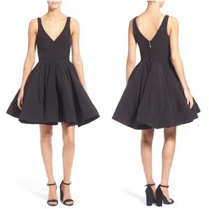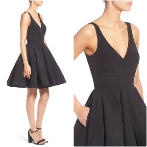 NWOT Double V-Neck Fit & Flare Party Dress Deep V-necklines dip into both sides of a darling cocktail dress that contrasts its sleekly fitted bodice with a lavishly flounced, twirl-ready skirt. Back zip closure Deep V-neck at front and back Sleeveless Side-seam pockets Wide inset waist Lined 100% polyester Spot clean Imported Special Occasion Color Black