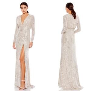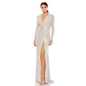 Long sleeved fully sequined evening gown accented with a ruched waist and thigh-high front slit.