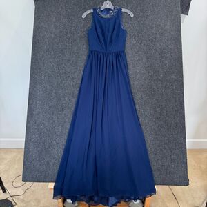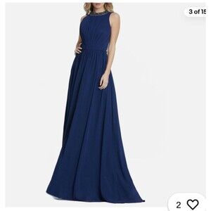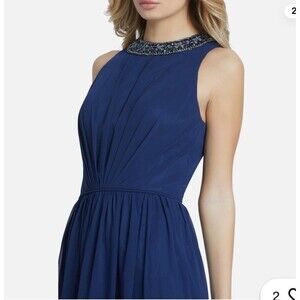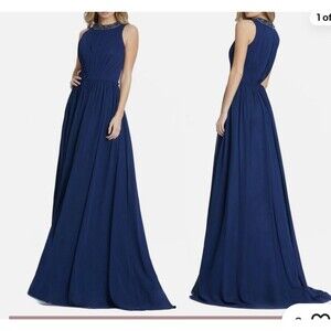 Ieena for Mac Duggal Dress Women's 4 Navy Blue Bejeweled Neckline Pleated Gown
