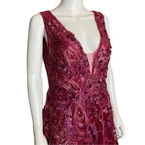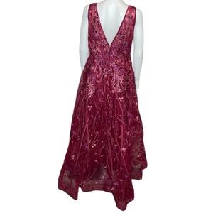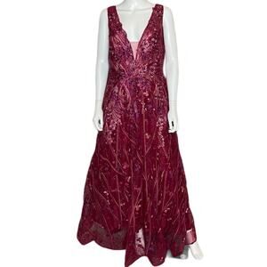 Ieena for Mac Duggal Embroidered Sleeveless Plunge Neck A-Line Gown Berry Sz 12