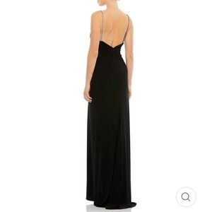 Elegant evening gown by Ieena for Mac Duggal, a stunning choice for your next special occasion. This black gown features a flattering V-neckline and a ruched bodice that accentuates the figure. The delicate rhinestone straps add a touch of sparkle and sophistication. Perfect for a formal event, a black-tie affair, or a glamorous night out.