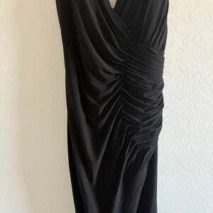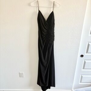 Keywords: Ieena for Mac Duggal, evening gown, formal dress, black dress, rhinestone straps, size 4, special occasion dress, prom dress, pageant dress, V-neck dress, ruched dress, cocktail dress, party dress, long dress, gown