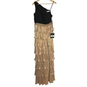 Ieena for Mac Duggal One Shoulder Dress Metallic Ruffle Gown Black Gold NWT 8