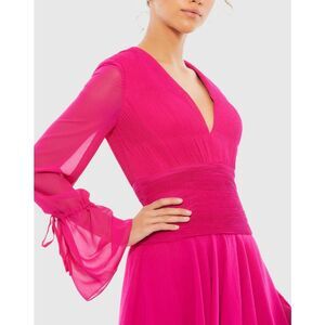 Flirty long sleeve chiffon cocktail dress with a pleated bodice and flowy bell sleeves.