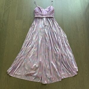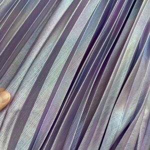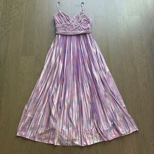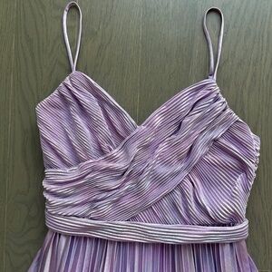 Ieena for Mac Duggal purple metallic iridescent pleated maxi dress.