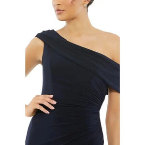 Ieena for Mac Duggal Ruched One-Shoulder Gown in Navy. Size 8. Features one-shoulder neckline, ruched waist, thigh-high slit, hidden back zipper closure, jersey fabric, and maxi length. Style 26517. 100% Polyester. Excellent pre-owned condition, no flaws.