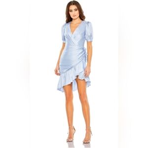 Ieena for Mac Duggal, Short Puff Sleeve Faux Wrap Mini Dress,Powder Blue, Size 4.