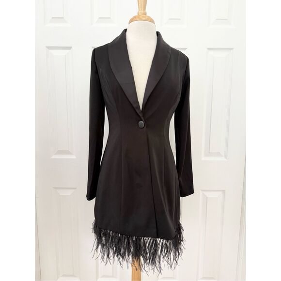 Ieena for Mac Duggal Womens Black Long Sleeve Feathered Trim Tuxedo Dress Size 2
