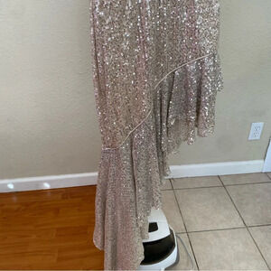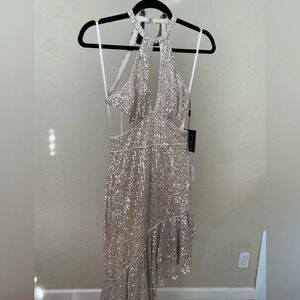 Ieena for Mac duggal sequined halter cut out ruffle Asymmetrical dress in nude