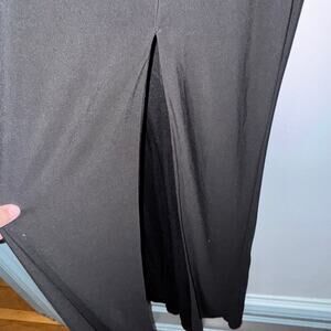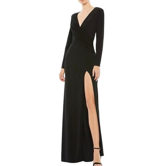 Ieena for MacDuggal Jersey Asymmetrical Ruched V-Neck Long Sleeve Thigh High Slit Sheath Gown NWT Size 12