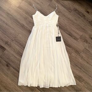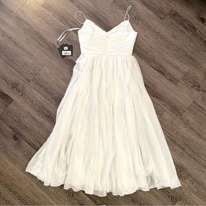 This spaghetti strap chiffon dress features a crossover v-neckline, ruched bodice, and a midi-length A-line skirt.
