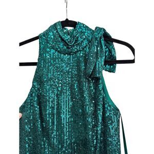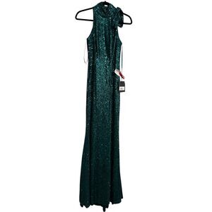 Stunning Ieena for Mac Duggal green sequin gown, perfect for your next special occasion! This dress is new with tags and in excellent condition. The halter neck and soft tie closure add a touch of elegance and sophistication. The green sequins catch the light beautifully, making you shine all night long. Don't miss out on this show-stopping piece!