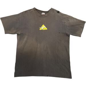 Faded charcoal black tee with bold back print that reads: “If not breathing and no pulse… it’s probably too late. You’re already dead. Not a great time to consider ETERNITY.” Includes scripture references from John 5:24 and Romans 6:23. Front chest shows the same stick figure icon in a caution triangle. Naturally worn with heavy fade, bleach marks, and shoulder distressing for a raw grunge aesthetic.