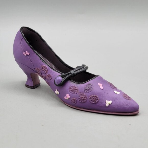 If The Shoe Fits Purple Shoe Figurine Floral Pattern Black Strap Kitten Heel