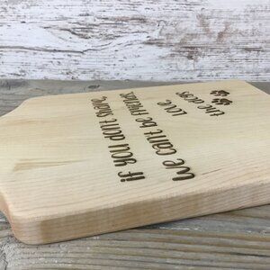 This handcrafted maple cutting board measures 13.5" x 7" x 0.5" and features a convenient paddle shape with a drip ring for functional use. The back is laser engraved with a playful message: “If you don't share we can't be friends. Love, The dogs” accompanied by two adorable pawprints. Because the engraving is on the back, you can use the front for everyday prep without affecting the design. A thoughtful gift for dog lovers or a charming addition to your own kitchen.