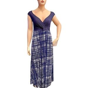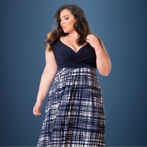 Igigi Valencia Empire Maxi Dress Plus 14/16 Navy Blue & White Plaid, Cap Sleeves
