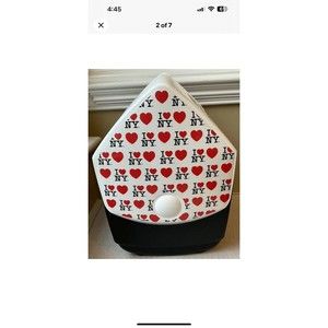 Get your hands on this limited edition Igloo Cooler featuring an all-over "I LOVE NY" logo design. This 7 QT Playmate Pal Cooler has never been used and is made of durable plastic material. Its compact size of 10.5" length, 8.5" width, and 12" height makes it easy to carry around on all your drinks.