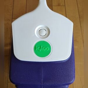 Compact Igloo MiniMate cooler. Features a vibrant purple base with a white top. Perfect for on-the-go cooling needs. Measures 8.5x6x6. Great pre-owned condition with mild scratches and minimal signs of wear.