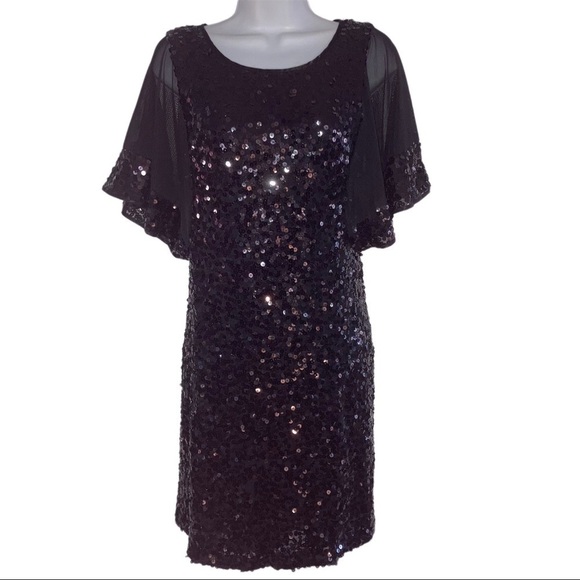 Ignite Evening Black Sequin stretch dress with sheer short flutter sleeves. Boat neck.