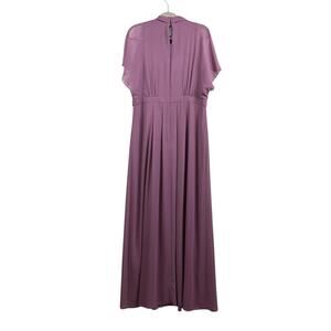 This long dress features a tie V neck, short flutter sleeves, and a zip closure.