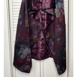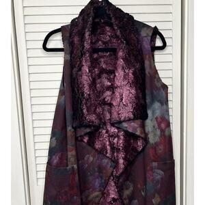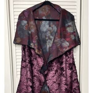A loosely structured, substantial gilet coat with a-line shaping with side edge splits, open front, and waterfall collar. This fully reversible style features a softly mottled floral print on one side, and a fabulous faux fur in a striking blackberry color on the reverse.