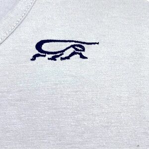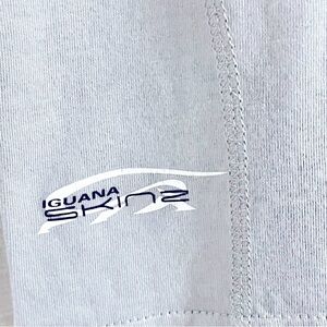This is an XL unisex light blue T-shirt by Iguana Skinz made of 70% bamboo and 30% cotton. It features a monogram design, a crew neck, and short sleeves. The shirt is designed for a relaxed fit and has a soft fabric that is easy to care for. It is suitable for all seasons and has a nature theme, making it ideal for golf, sports, or athletic activities.