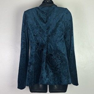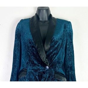 Beautiful not your traditional ball gown. Innately classic yet defiantly modern, no one can deny glamour of this teal tuxedo blazer. velvet, paisley print, single breasted style, satin shawl lapel, padded shoulders, 2 back vents, doubled welted pockets