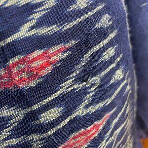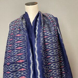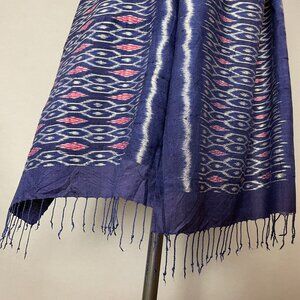 Rectangular scarf with an ikat pattern in blue, white, and pink. Fringe on the ends. No brand, care, or materials tags.