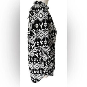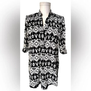 This black and white patterned tunic blouse features a pleasing print that pairs well with all colors of pants or skirts! This blouse has a deep V spit neck with mandarin collar and longer length. Roll tab sleeves can be worn up or down. The hem in back is slightly lower than in front.