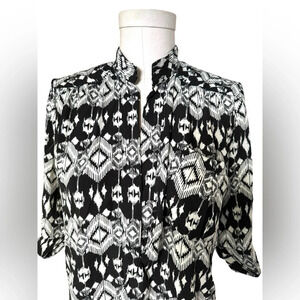 Tags: ikat, spit neck blouse, tab sleeve, pattern, black and white, mandarin collar, maximalism, tunic, business casual, drapey