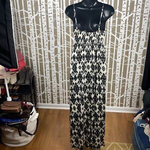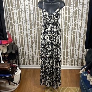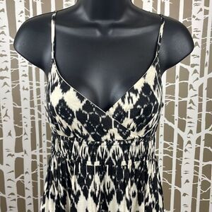 LOFT Ikat Print Boho Maxi Dress sz XS. Features lightweight and breathable viscose lyocell blend fabric in a cream and black Ikat print, crossover V-Neck front, double elasticized empire waistband, adjustable straps, fully lined through chest area. Gently worn and laundered with no flaws to note.