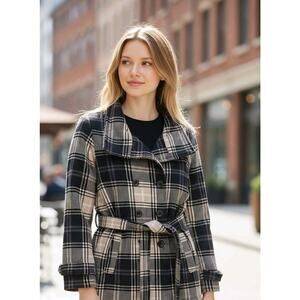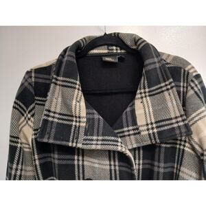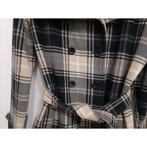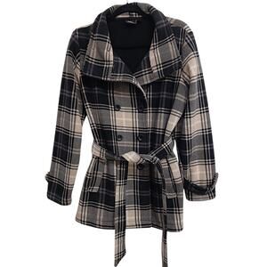 Ike Behar Fleece Pea Coat Jacket Sz L Gray Beige Plaid Check Tie Button Preppy