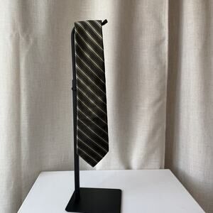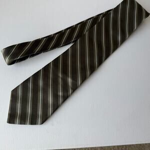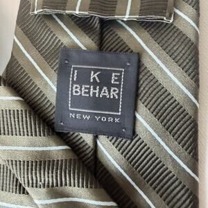 Timeless Ike Behar New York silk-cotton tie featuring an olive-brown diagonal stripe pattern and subtle ribbed texture. Made around 2008, originally retailing $65–$85.