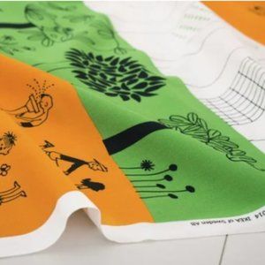 High quality thick cotton fabric: green, orange and white striped background with kids pattern.