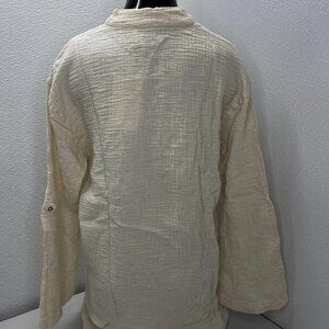 Features: Crinkled texture, V-neckline, relaxed fit, long sleeves, breathable fabric, pullover style