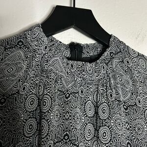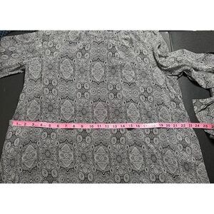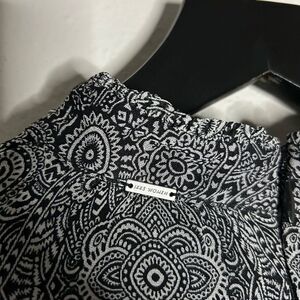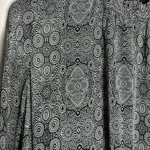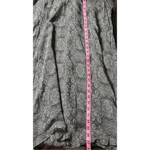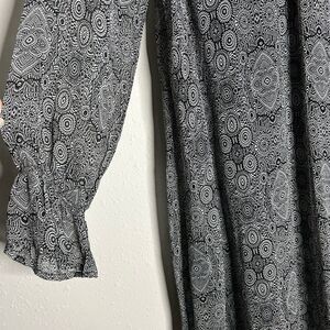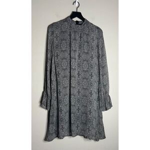 Mandala pattern dress in gray from Ikks. Partially lined. Ruffle cuff long sleeve. Size 34. See photos for measurements. Matching belt is missing but otherwise in good preowned condition with no tears or stains.