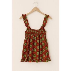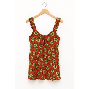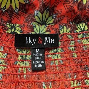 Brighten up your wardrobe with this Iky & Me floral print tank top in size Medium. This vibrant piece features an orange base with bold green floral pattern, a front tie cutout detail, and ruffled straps for a feminine touch. Made from 100% rayon, it’s soft, lightweight, and perfect for warm-weather styling.