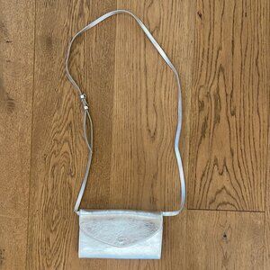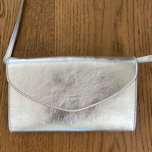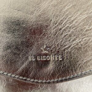 Essential and elegant clutch in vegetable-tanned metallic leather. Snap button under flap. Removable and adjustable shoulder strap. The leather-lined interior contains two compartments divided by a zippered partition and 8 card pockets featuring the iconic wave contour. 100% made in Italy and produced in the province of Florence by master craftsmen in Il Bisonte's 30-Km supply chain.