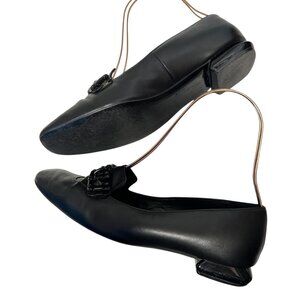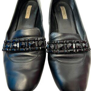 Il Passo loafer flats, black leather, bejeweled strap, round toe, slip on, leather lining and soles, EU 39 / US 9, insole length: 10.25", preowned and shows wear on the soles, creasing and scuffing, small flaws on the heels - see photos